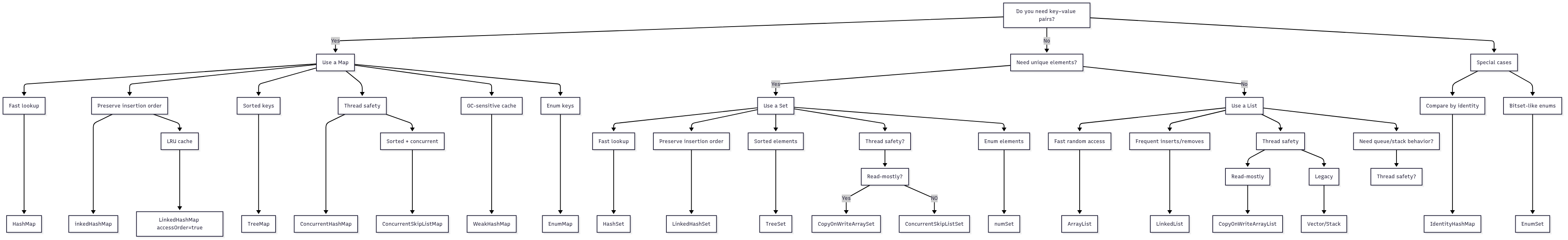 Need ordering? → LinkedHashMap / TreeSet / TreeMap.
